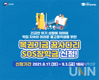 [한국대학신문 황정일 기자] 교육부와 한국장학재단은 복권기금 꿈사다리 장학사업 SOS장학생 2차 신청을 8월 17일부터 9월 3일 18시까지 18일간 실시한다. 복권기금 꿈사다리 장학사업은 복권기금을 재원으로 저소득층 우수 중·고생을 선발해 대학까지 연계 지원하는 국가 장학사업이다.