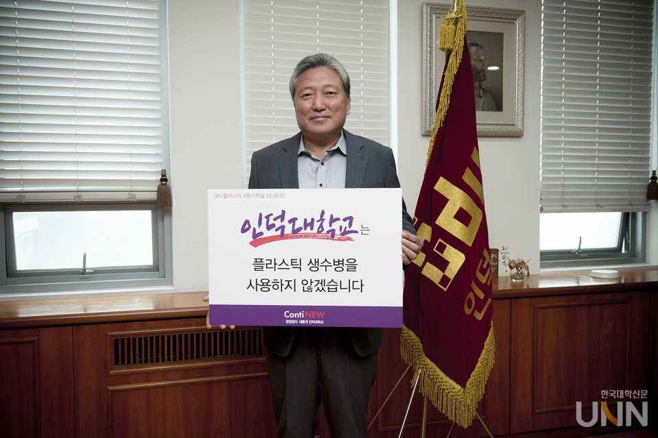윤 총장은 25일 인덕대 공식 홈페이지와 SNS를 통해 ‘인덕대학교는 플라스틱 생수병을 사용하지 않겠습니다’라는 팻말을 들고 캠페인에 동참한 사진을 공개했다.