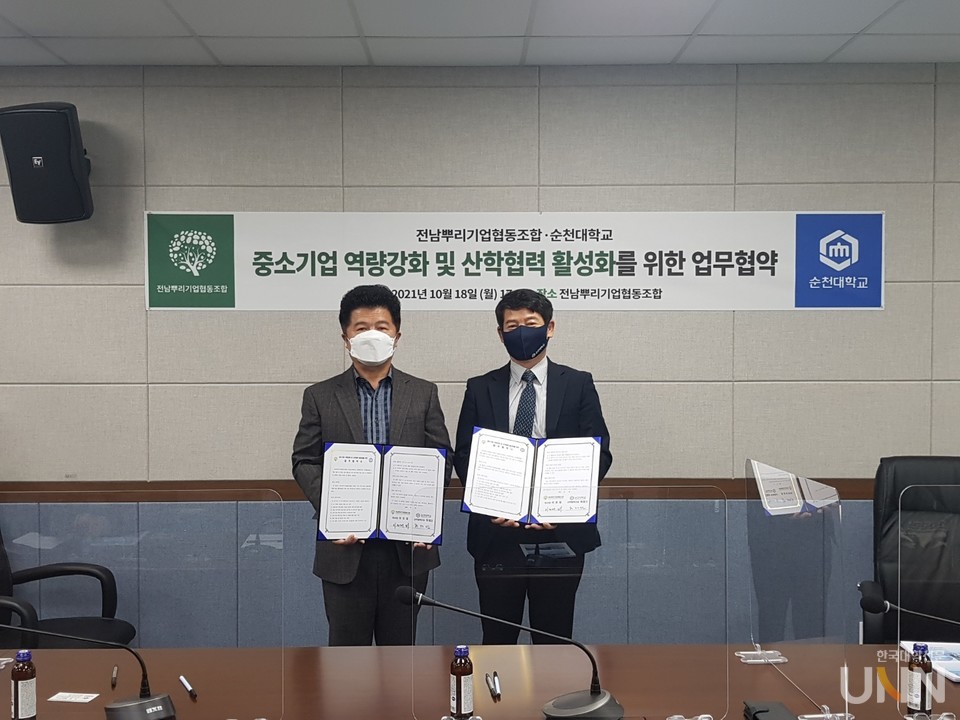 [한국대학신문 이원지 기자] 순천대학교(총장 고영진)는 18일 오후 5시에 순천뿌리기술지원센터 1층 회의실에서 전남뿌리기업협동조합과 ‘지역 중소기업 역량강화 및 산학협력 활성화를 위한 업무협약’을 체결했다.