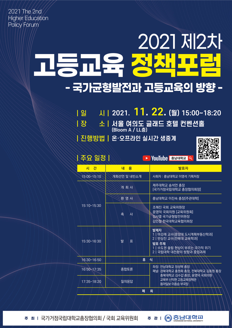 [한국대학신문 조영은 기자] 국가거점국립대학교총장협의회(회장 송석언 제주대 총장)가 ‘2021년 제2차 고등교육 정책포럼’을 국회 교육위원회(위원장 조해진)와 함께 22일 서울 여의도 글래드 호텔에서 개최한다. 포럼은 대면과 충남대 유튜브를 활용한 비대면으로 동시에 진행된다.