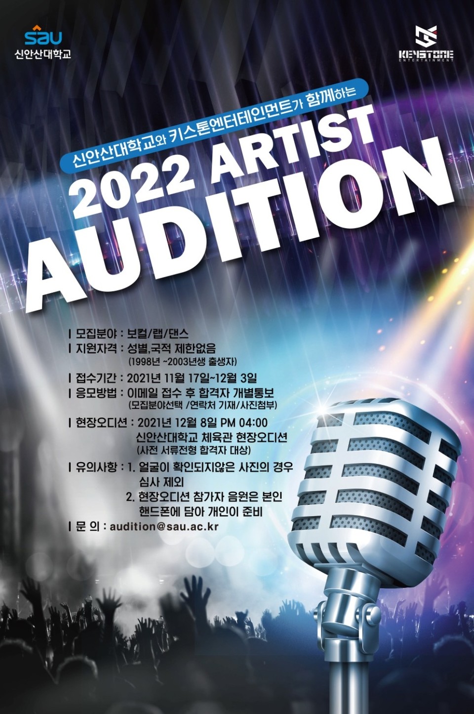[한국대학신문 조영은 기자] 신안산대학교(총장 강성락)는 키스톤엔터테인먼트(대표 최성묵)와 함께 글로벌 음악시장에서 활동할 신인 아티스트를 선발하는 공개 오디션을 12월 3일까지 진행한다.