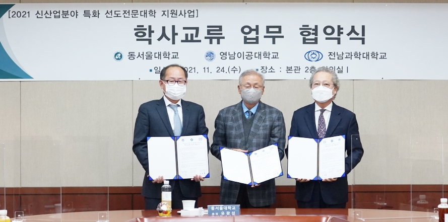 [한국대학신문 조영은 기자] 동서울대학교(총장 유광섭)는 영남이공대학교(총장 이재용), 전남과학대학교(총장 이은철)와 신산업분야 특화 선도전문대학 지원사업 일환으로 지난달 학사교류 업무 협약을 체결했다고 전했다.
