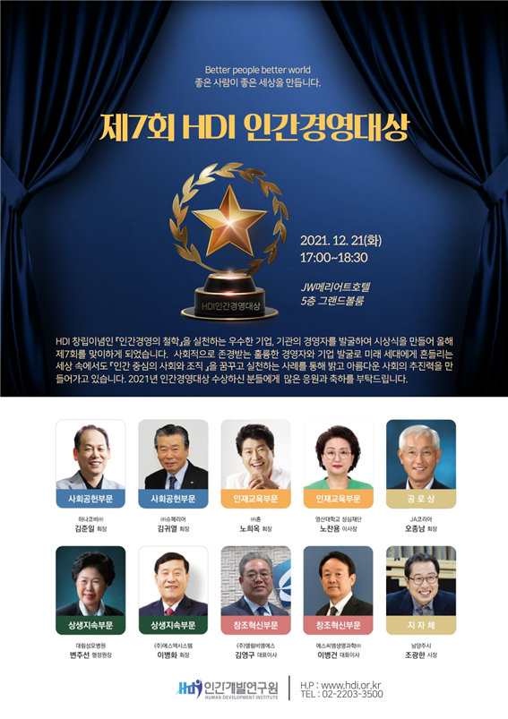 [한국대학신문 조영은 기자] HDI인간개발연구원(회장 문용린)이 ‘제7회 HDI인간경영대상시상식’을 21일 진행한다.
