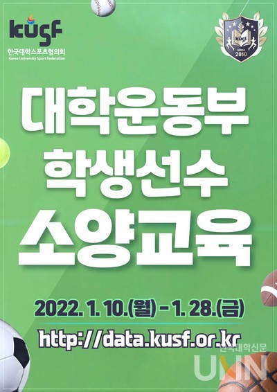 [한국대학신문 황정일 기자] 한국대학스포츠협의회(회장 정진택 고려대 총장, 이하 KUSF)는 1월 10일부터 약 2주간 ‘대학운동부 학생선수 소양교육’을 개최한다. 코로나19 확산 방지를 위해 지난해에 이어 올해도 온라인으로 진행되는 이번 교육은 KUSF가 주최·주관하며 문화체육관광부와 국민체육진흥공단이 후원한다.