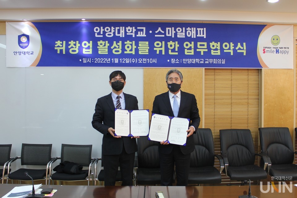 [한국대학신문 조영은 기자] 안양대학교(총장 박노준) 대학일자리본부는 스마일해피와 지역 청년 취 · 창업 활성화를 위한 업무협약을 12일 체결했다.