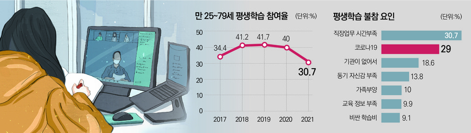 조사 결과 2021년 평생학습 참여율은 30.7%로 성인 10명 중 3명이 평생학습에 참여한 것으로 파악됐다. 이는 전년 40.0% 대비 9.3%p 감소한 수치다. 특히 전년 대비 두드러진 평생학습 불참 요인이 코로나19 영향으로 나타났다.