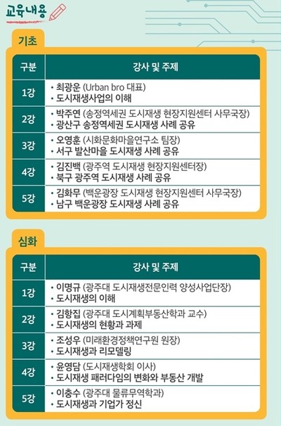 심화 교육과정에는 이명규 광주대 도시재생전문인력 양성사업단장의 ‘도시재생의 이해’, 김항집 광주대 도시계획부동산학과 교수 ‘도시재생의 현황과 과제’ 등 5개의 강좌로 마련됐다.