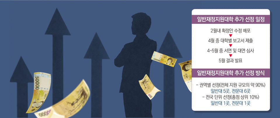 선정방식은 전체 지원규모의 약 90%(일반대 5곳, 전문대 6곳)을 권역별(수도권-비수도권)로 선정한 후 약 10%(일반대 1곳, 전문대 1곳)를 전국 단위로 총점이 가장 높은 대학을 선정하게 된다.