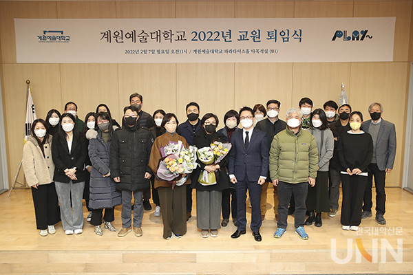 퇴임식 행사는 코로나 19 감염 방지를 위해 최소한의 인원이 참석한 가운데 진행됐다. 권창현 계원예술대 총장은 그동안의 노고에 감사의 마음을 담아 공로패와 꽃다발을 전달했다.