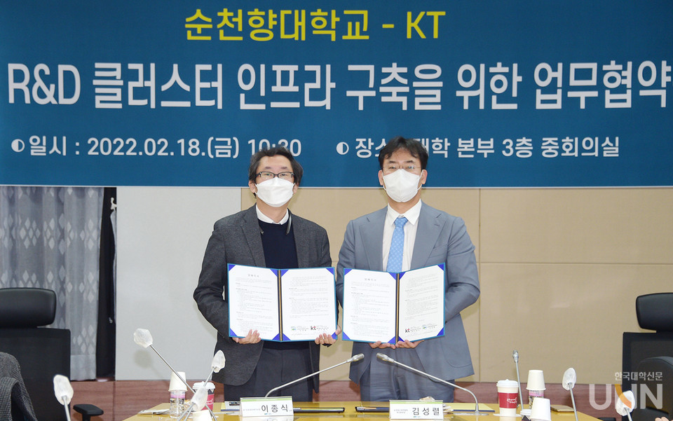 협약식에는 김성렬 순천향대 산학연협력추진본부장, 김홍래 공과대학장을 비롯해 이종식 KT 융합기술원 인프라 DX연구소장, 이병용 KT 천안법인 고객영업부 지사장 등 각 기관 관계자들이 참석했다.