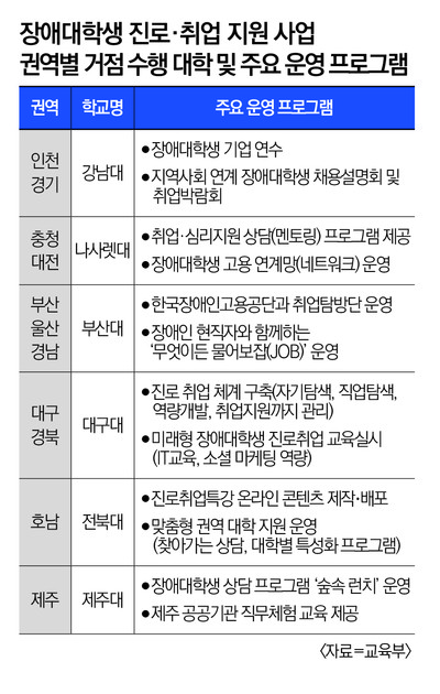 교육부는 장애대학생 진로·취업 사업을 수행할 권역별 거점대학 6개교를 선정해 23일 발표했다.