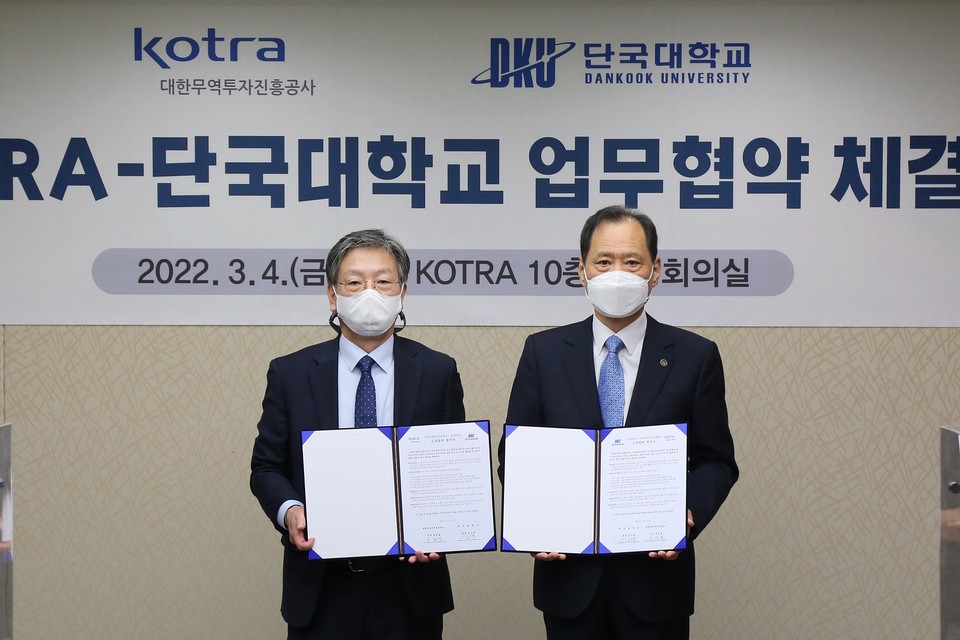[한국대학신문 조영은 기자] 단국대학교(총장 김수복)는 ‘바이오헬스혁신공유대학사업’ 추진을 위해 KOTRA(대한무역투자진흥공사, 사장 유정열)와 4일 교류협력 협약을 체결했다고 전했다.