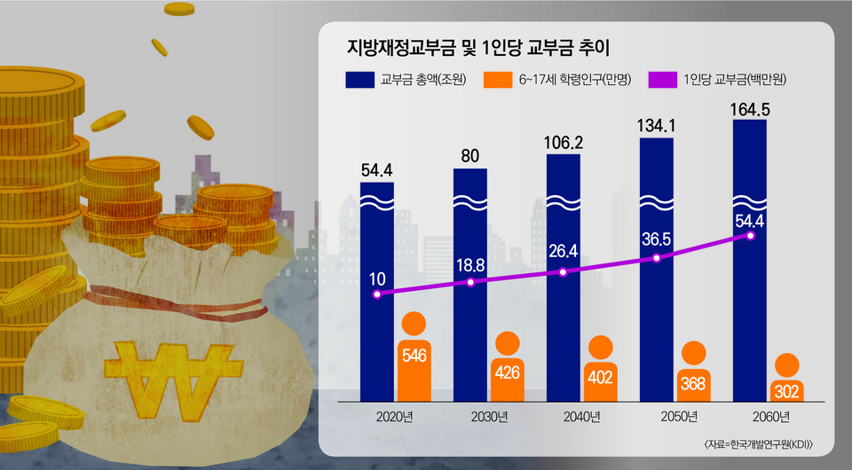 한국개발연구원(KDI)에 따르면 현재 학령인구는 약 540만 명에서 오는 2060년 300만 명 수준으로 줄어든다. 현행 교부금 배분 방식을 계속 적용할 경우 학생 1인당 평균 교부금은 현재 1000만 원 수준에서 2060년 5400만 원까지 늘어난다. 학령인구가 줄면서 대학 재정은 한없이 나빠질 때 초·중·등 재정만 넘쳐나게 되는 셈이다.