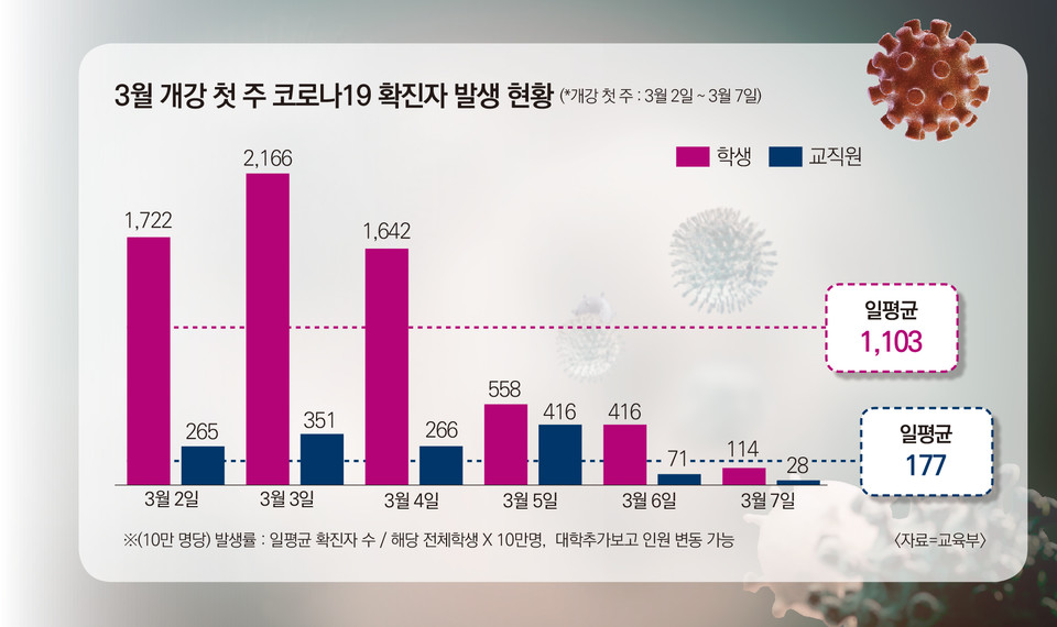 교육부가 지난 8일 발표한 ‘1학기 개학 첫 주 학사운영 현황’에 따르면 지난 2~7일 학생 확진자는 총 6608명, 교직원 확진자는 1067명으로 집계됐다. 학생 10만 명당 확진자 발생률은 34.1명을 기록했다.