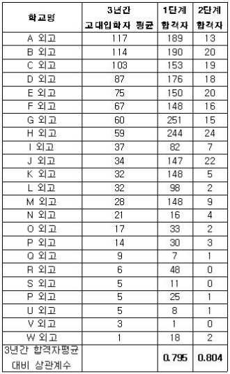 권 의원에 따르면 전국 26개 외고를 대상으로 지난 3년간 고대 입학실적과 수시2-2 1단계 합격비율을 비교한 결과 상관관계가 0.795가 나왔다. 2단계 합격자가 3년간 고대 입학자 간의 상관계수는 0.804에 이르는 것으로 나타났다. (위 그림 참고)