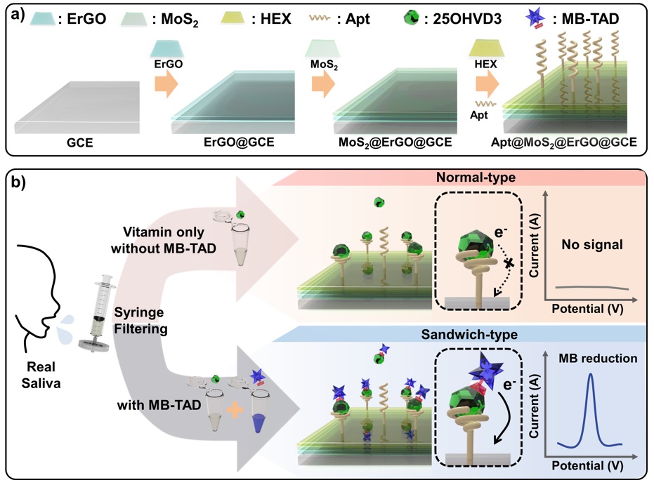 기존 비타민D 검출은 주로 혈액샘플에서 분석하지만 공동연구팀은 침 샘플에 존재하는 비타민D3를 고민감도, 고선택도 검출 할 수 있는 ‘비침습 기반 비타민 D 검출용 샌드위치 타입 압타 센서’를 개발했다.