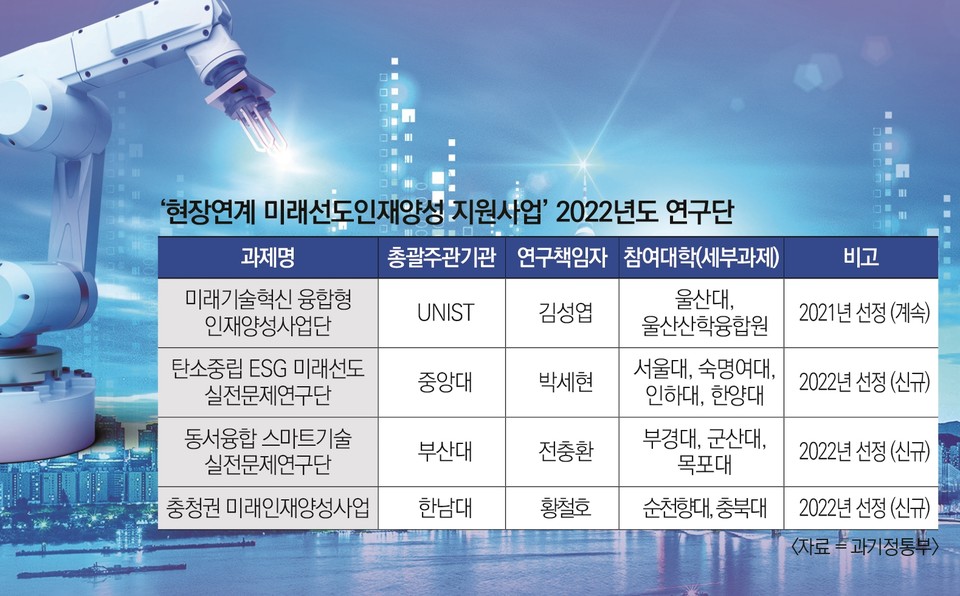 [한국대학신문 장혜승 기자] 과학기술정보통신부(장관 임혜숙, 이하 ‘과기정통부’)는 이공계 대학생의 산업계 문제해결 역량 강화를 위한 ‘현장연계 미래선도인재양성 지원사업’ 2022년도 신규 연구단 선정 결과를 지난 20일 발표했다.