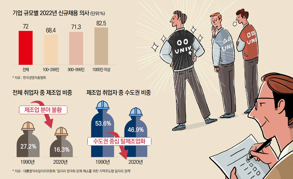 ■ ‘훈풍’ 불면 뭐하나, 수도권으로…질 높은 일자리 찾아 떠나는 지역 청년들 = 대졸 채용시장 훈풍은 비수도권에 거주하는 취준생들에게는 남 얘기다. 거두절미하고 양질의 일자리가 수도권에 집중돼 있기 때문이다. 지난해 12월 한국직업능력연구원이 공개한 ‘지역대학 졸업자의 노동이동과 노동시장 성과 분석’ 보고서에 따르면 “한국은 지난 수십 년간 경제발전이라는 명목 아래 자본과 일자리가 수도권으로 집중됐다”며 “하지만 수도권으로의 경제 집중이 지역 간 격차를 발생시켜 사회통합에 걸림돌이 되고 국가 경제발전에 부정적인 영향을 미칠 수 있다는 우려로 역대 정부는 한결같이 지역균형발전과 지역대학 활성화 정책을 추진했다. 하지만 지역경제와 위기는 지속되고 있다”고 분석했다.