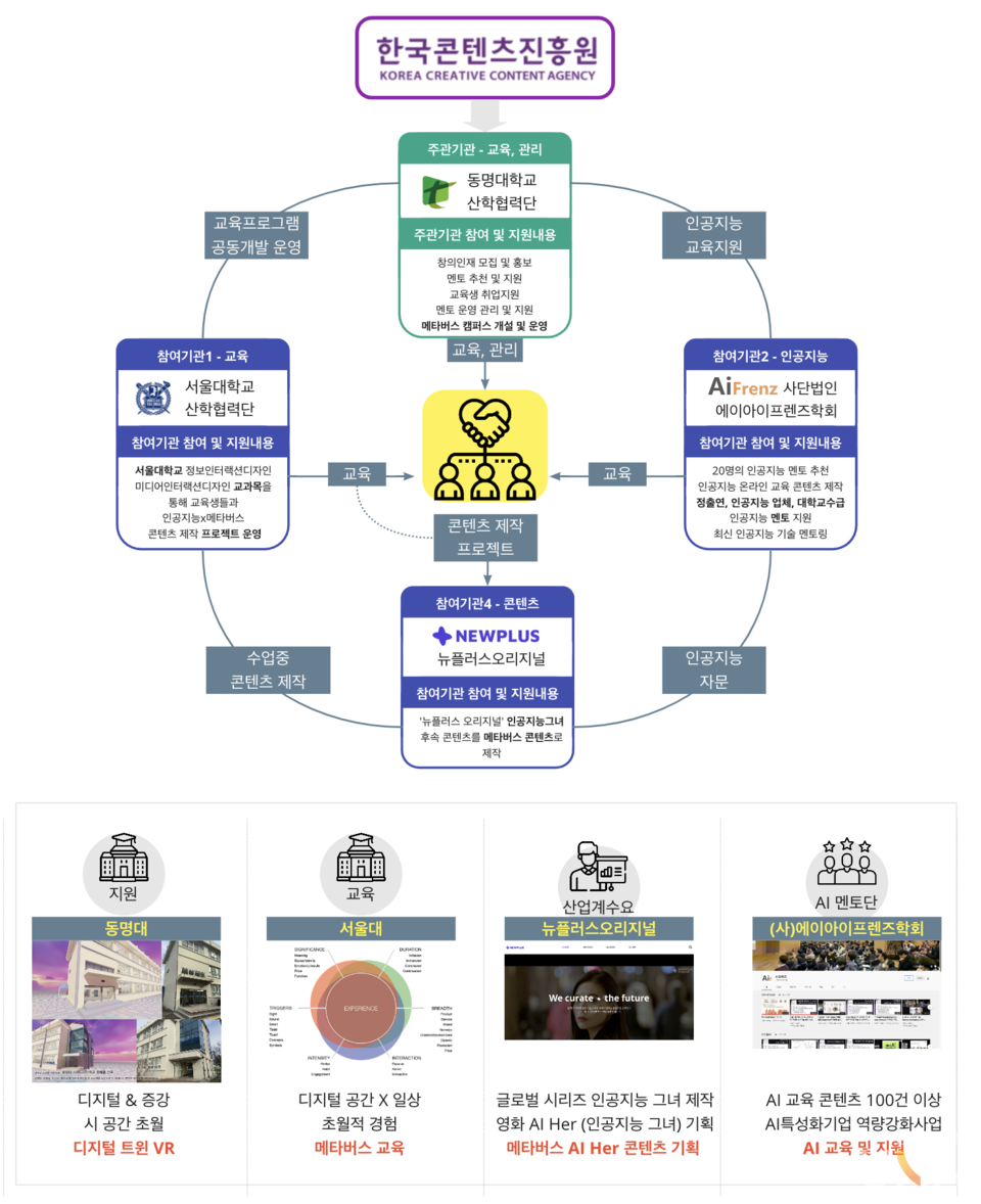 이 사업은 이달부터 11월 31일까지 인공지능 연계 콘텐츠의 프로젝트 기반 교육운영이 가능한 기관(컨소시엄)에 4억6500만원 이내 국고를 지원하는 사업이다. 인공지능 시대에서 콘텐츠를 제작하면서 인공지능의 구성 요소들을 메타버스 환경 내에서 정밀하게 구현할 전문 인력을 양성할 예정이다.