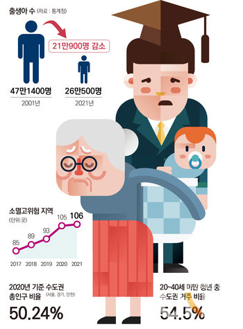 다른 하나는 지방소멸이다. 지방에 거주하는 사람들이 수도권으로 이동하면서 우리 지역이 사라질지도 모른다는 공포가 비수도권에서 대두되고 있다. 작년 7월 감사원이 발표한 ‘인구구조변화 대응실태’ 감사 보고서에 따르면 2047년이 되면 한국 전체 인구는 4771만 명이 되며 2117년 1510만 명까지 추락할 것이라고 전망했다. 특히 현재 228개 전국 시·군·구 중 2067년이 되면 서울·경기만 인구 100만 명을 유지할 것으로도 내다봤다. 최근 한국고용정보원이 공개한 ‘포스트 코로나19와 지역의 기회’ 보고서에서도 ‘소멸위험지수’를 언급하며 한국의 인구절벽 위기를 경고했다. 한국고용정보원에 따르면 228개 전국 시·군·구 중 소멸위험지역은 △85곳(2017년) △89곳(2018년) △93곳(2019년) △105곳(2020년) △106곳(2021년)이었다. 심지어 소멸고위험지역으로 분류된 곳은 2020년 23곳에서 2021년 36곳으로 13곳이나 늘었다.
