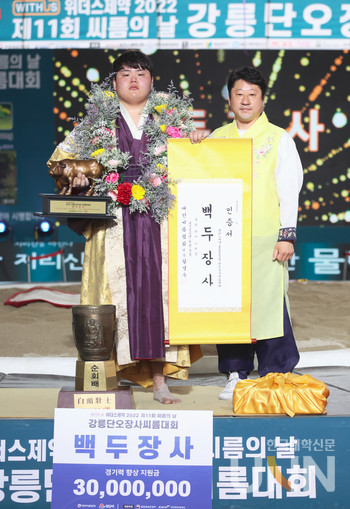 김 선수는 5일 강원도 강릉시 강릉단오제 행사장 내 야외 특설 씨름경기장에서 열린 백두장사 결정전(5전 3승제)에서 증평군청 김진 선수를 3 대 1로 제압하고 우승을 차지했다.