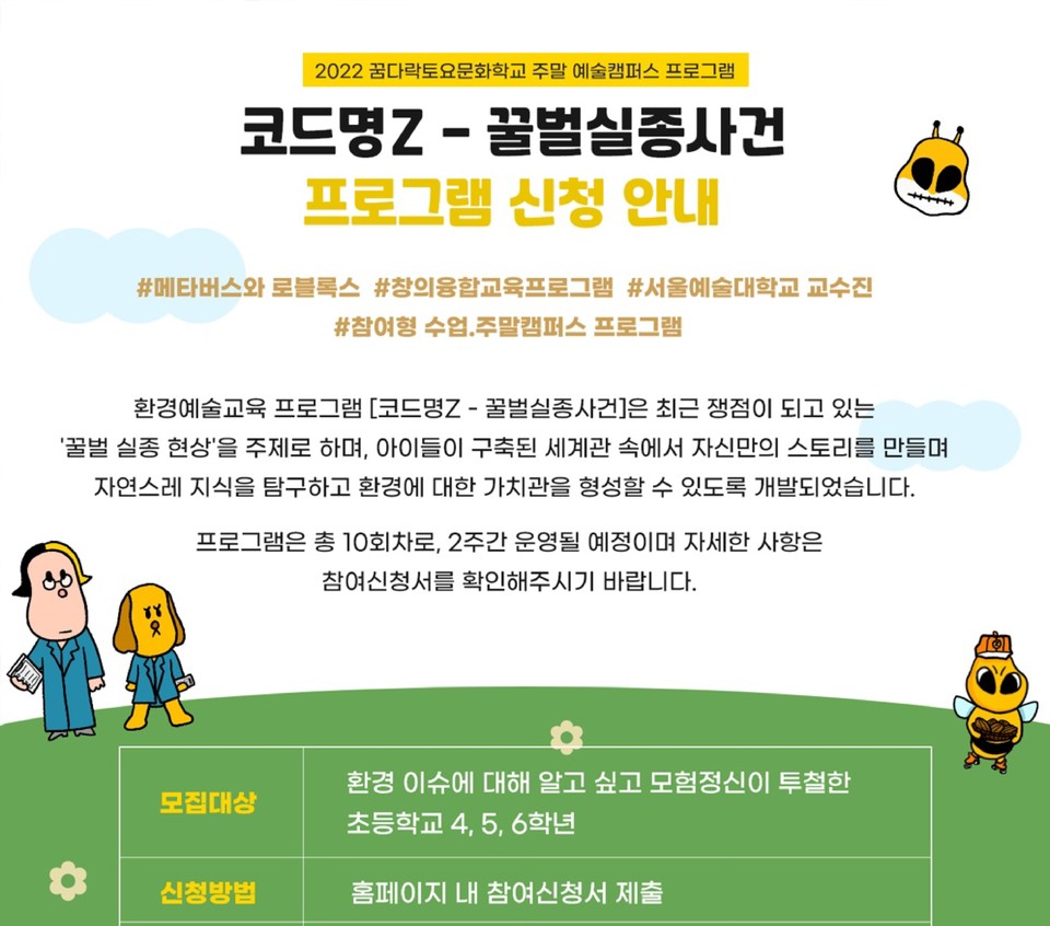 대학 관계자는 “‘코드명Z-꿀벌실종사건’은 ‘환경문제는 단순히 단편적인 환경문제로 접근할 수만은 없으며 정치·사회·경제·문화 예술 등 다양한 분야와 유기적으로 연결돼 있다’는 것을 가르치고자 기획됐다”면서 “참여 초등학생들이 ‘한 가지의 환경문제가 어떠한 인과관계를 거쳐 발생하게 됐는가?’에 대한 의문을 선택적 경험과 스토리리빙을 통해 자연스레 인식할 수 있을 것으로 기대한다”고 말했다.