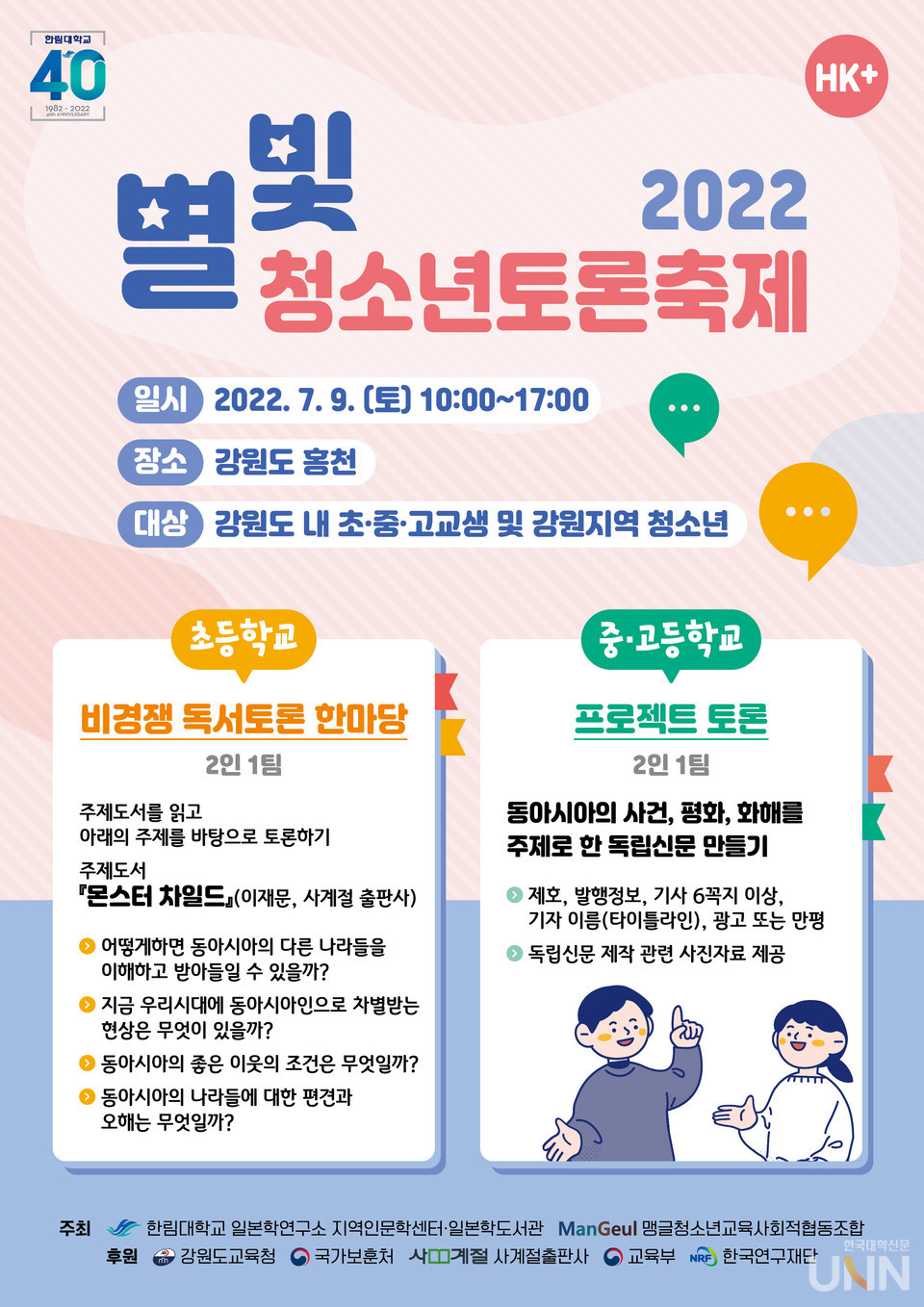 [한국대학신문 이원지 기자] 한림대학교(총장 최양희) 일본학연구소 지역인문학센터가 강원 지역 청소년을 대상으로 동아시아 화해와 협력을 주제로 한 비경쟁 인문독서토론 한마당 ‘2022년 별빛청소년토론축제’를 9일 개최한다.