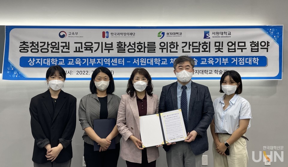 [한국대학신문 조영은 기자] 상지대학교(총장 홍석우) 충청강원권 지역센터는 서원대와 충청강원권 내 교육기부 문화 확산과 양질의 프로그램 제공을 위해 업무협약을 25일 체결했다고 전했다.