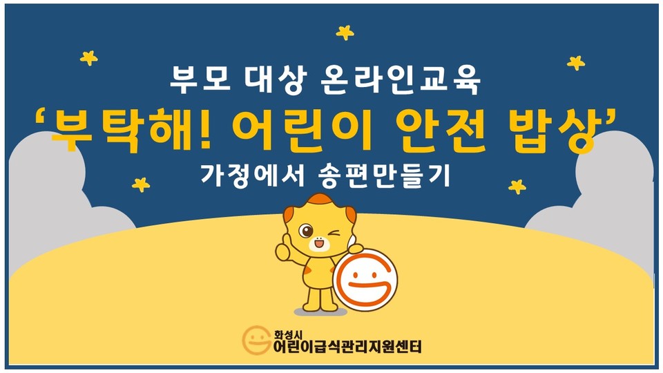 ‘부탁해! 어린이 안전 밥상’ 부모 온라인 교육은 화성시 어린이급식관리지원센터에 등록된 어린이 급식소의 부모를 대상으로 진행하며 12일까지 선착순 300명의 접수를 받는다. 교육 신청 및 자세한 내용은 화성시 어린이급식관리지원센터 교육홈페이지에서 확인할 수 있다.