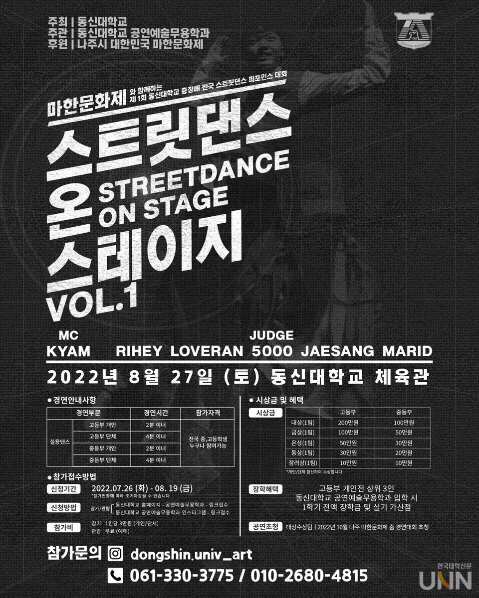 [한국대학신문 이정환 기자] 동신대학교(총장 이주희)가 27일 ‘마한문화제와 함께하는 제1회 동신대학교 총장배 전국 스트릿댄스 퍼포먼스 대회’를 개최한다.