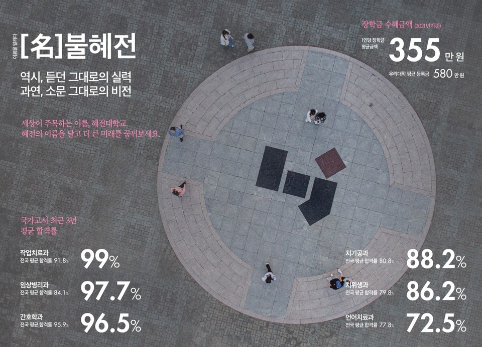 ■ 풍부한 장학혜택…‘홍성역-학교’ 무료 셔틀버스 상시운행 = 혜전대는 학생들이 학비 부담 없이 학업에 전념할 수 있는 환경을 조성하기 위해 풍부한 장학혜택을 제공한다. 국가장학금은 물론 다양한 장학혜택이 제공된다. 구체적으로 혜전드림장학금(등록금 전액)은 국가장학금 0~8구간 이내 신입생이라면 누구나 혜택받을 수 있고, 이사장 장학금(등록금 전액), 총장 장학금(등록금 전액)과 같은 성적우수장학금과 향토지역인재장학금(100만 원), 면접위주전형장학금(50만 원) 등 풍부한 교내·외 장학제도를 운영해 학생들의 등록금 부담을 완화하고 있다.
