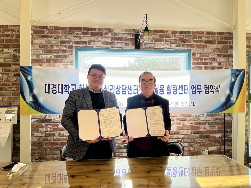 [한국대학신문 정혜정 기자] 대경대학교(총장 이채영) 학생진로심리상담센터(센터장 조중현 교수)와 라온혜윰 힐링센터(센터장 백용매)는 대경대 재학생들의 심리 건강 증진을 위한 업무 협약을 체결했다.