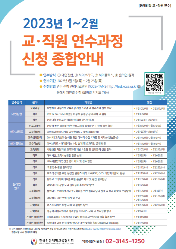 전문대교협은 지난 5일부터 다음달 23일까지 전국 대학 교·직원들을 대상으로 1~2월 동계방학 집중 연수를 진행한다. 수요자 중심의 4개 연수방식, 7개 연수분야에서 20개 연수과정을 총 32회차 개설하고 운영한다.