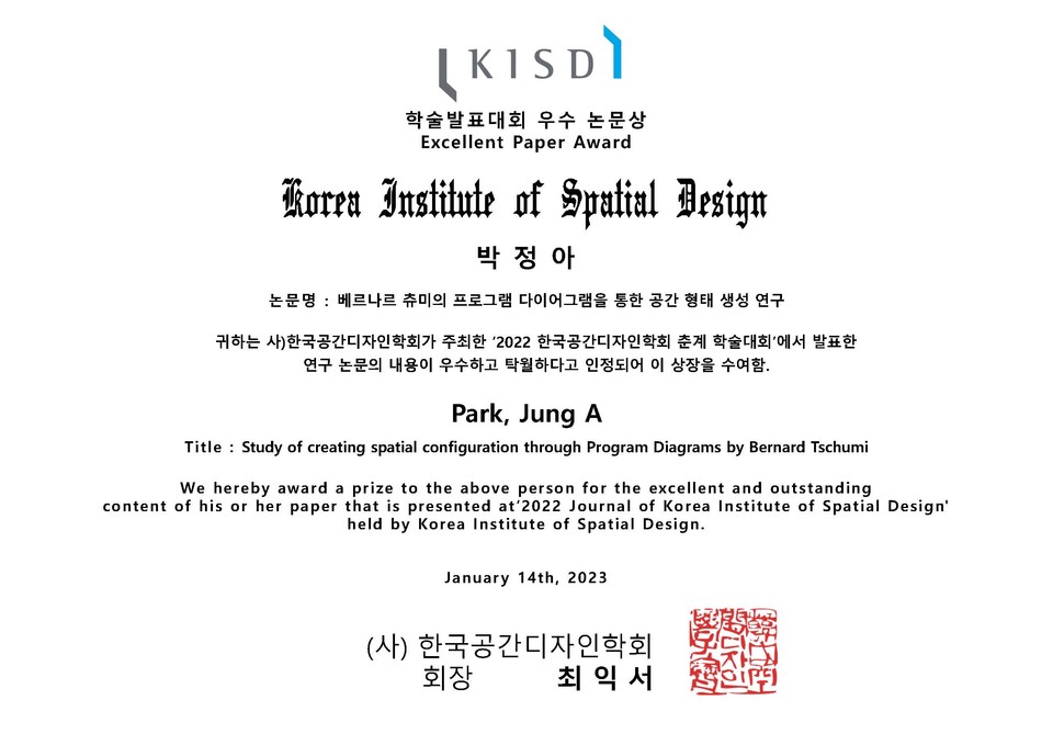 박정아 교수의 주저자 단독논문으로 게재된 창의적 디자인 설계에 있어 공간 형태 생성에 관한 논문인 ‘베르나르 츄미의 프로그램 다이어그램을 통한 공간 형태 생성 연구’라는 제목으로 2022 한국공간디자인학회 논문집 vol.17 No.4 통권81호에 게재됐다.