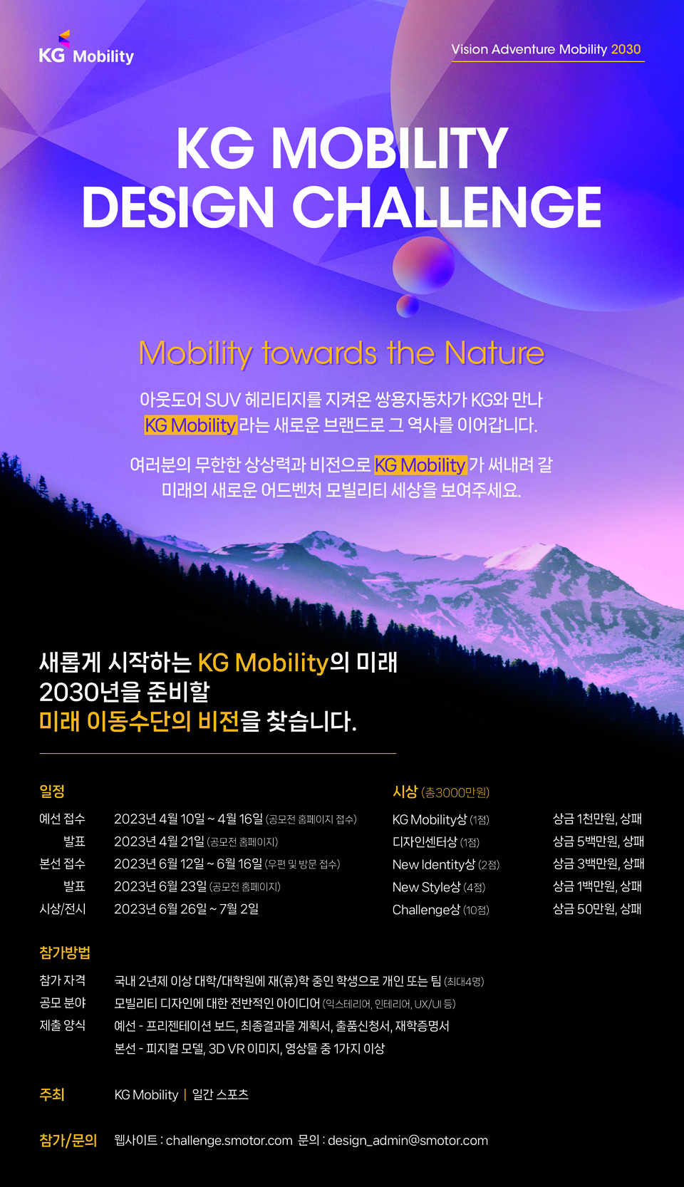 무한한 상상력과 비전으로 쌍용자동차의 새로운 이름 ‘KG Mobility’가 써내려 갈 미래의 새로운 어드벤처 모빌리티 세상을 보여줄 이번 디자인 공모전은 1차 예선과 2차 본선으로 나눠 진행하며 공모 분야는 자동차 익스테리어, 인테리어, UX/UI 등 모빌리티 디자인에 대한 전반적인 아이디어를 디자인하여 제출하면 된다. 국내 대학생 및 대학원생이면 누구나 참여가 가능하며, 개인 또는 4인 이하의 팀을 구성하여 응모할 수 있다.