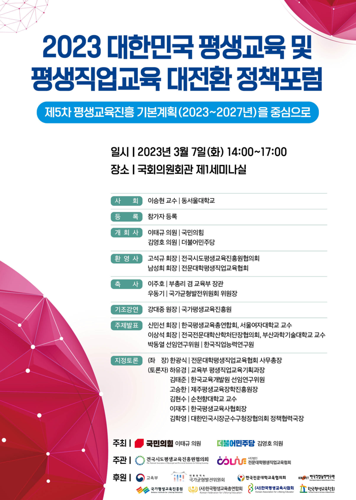 [한국대학신문 우지수 기자] 국회 교육위원회 간사 이태규 국민의힘 의원과 김영호 더불어민주당 의원이 ‘2023 대한민국 평생교육 및 평생직업교육 대전환 정책포럼’을 의원회관 제1세미나실에서 7일 오후 2시 개최한다.