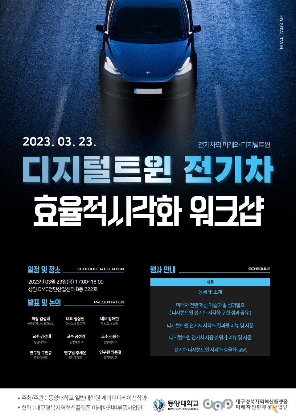 [한국대학신문 이정환 기자] 동양대학교(총장 이하운)는 ‘디지털트윈 전기차 효율적 시각화 워크숍’을 오는 23일 오후 5시 서울 상암동 DMC첨단산업센터(B동 222호)에서 개최한다고 밝혔다.