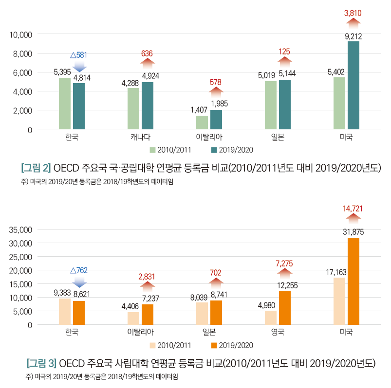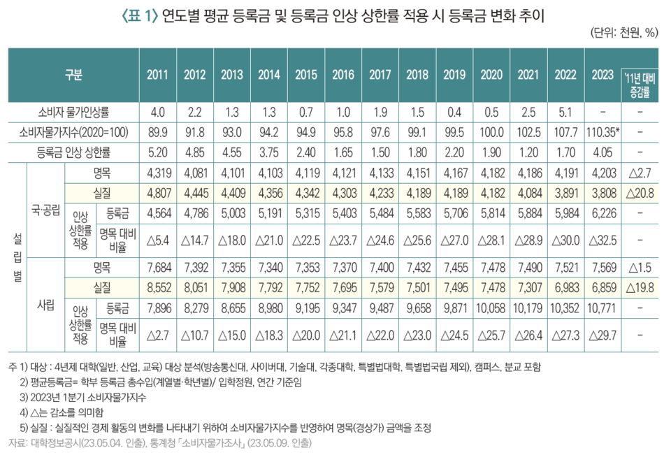 분석 결과에 따르면 2023년 소비자물가인상율을 반영한 국·공립대학 평균 실질등록금은 380만 8000원, 사립대학은 685만 9000원으로 나타났다. 2011년 대비 각각 20.8%, 19.8% 인하된 수준이다. OECD 주요국의 등록금 비교하면 2010·2011년도 대비 2019·2020년도에 모두 인상됐으나 우리나라만 국·공립 581달러, 사립 762달러로 각각 감소했다. 15년간 이어진 등록금 동결·인하로 인해 평균등록금이 감소한 것으로 보인다.