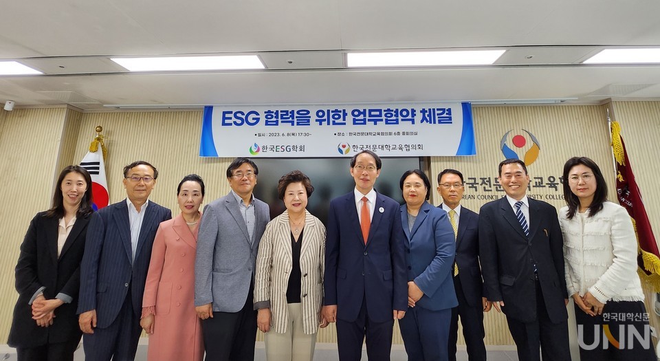 [한국대학신문 우지수 기자] 한국전문대학교육협의회(회장 남성희, 대구보건대 총장)와 한국ESG학회(학회장 고문현 숭실대 교수)가 ESG 문화 진흥과 ESG 협력 활성화에 따른 제반 사항을 공유·협의 지원하는 MOU를 지난 8일 전문대교협 중회의실에서 체결했다.