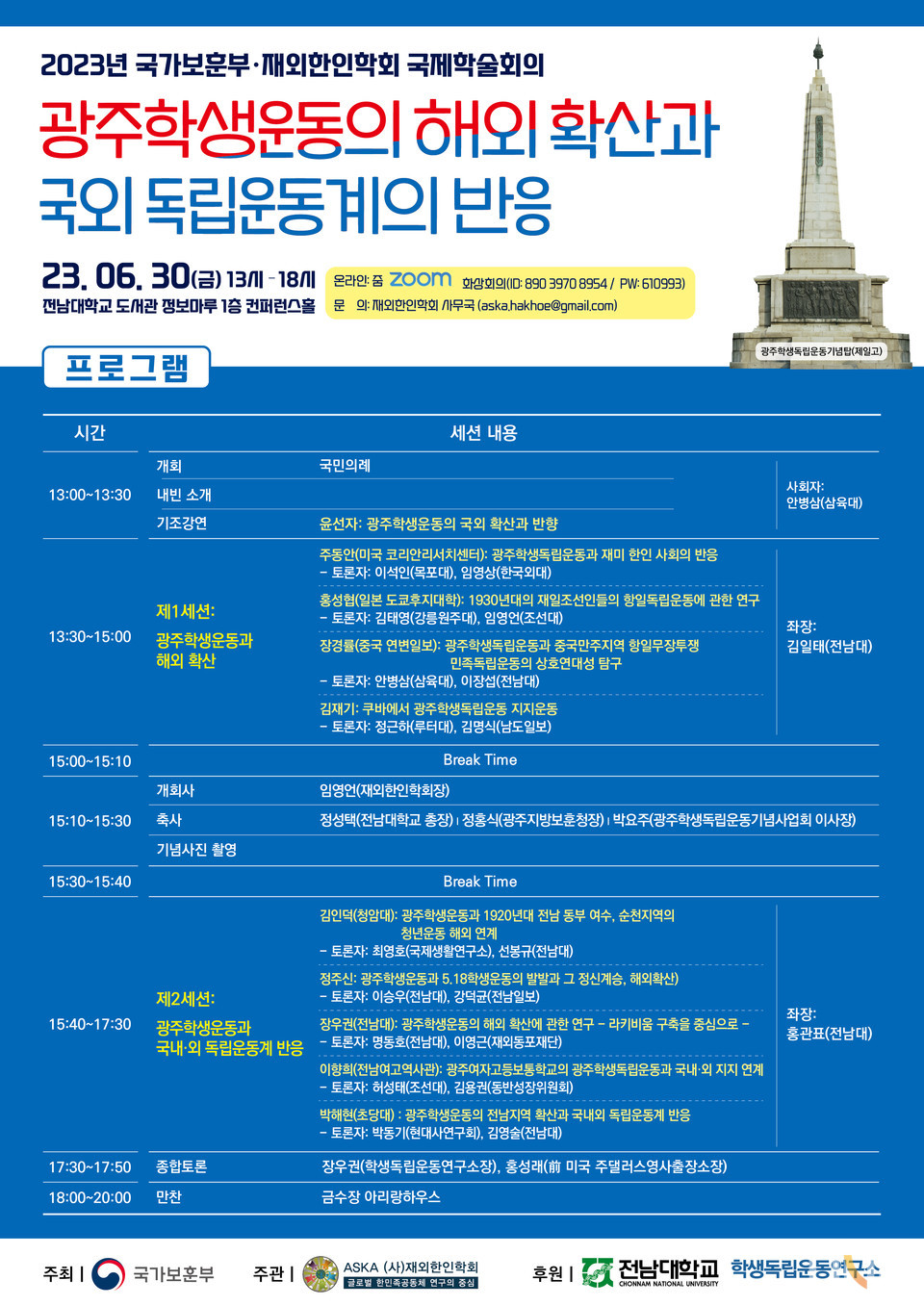 전남대 학생독립운동연구소(소장 장우권)가 국가보훈부와 재외한인학회(회장 임영언)와 함께 마련한 이번 학술대회에서는 전남대 윤선자 교수가 ‘광주학생운동의 국외 확산과 반향’을 주제로 학술대회 기조강연을 맡는다.