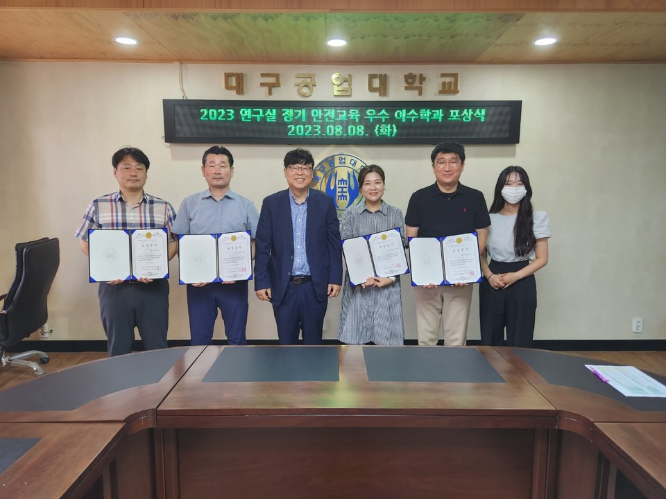 [한국대학신문 김한울 기자] 대구공업대학교(총장 이별나)가 ‘2023학년도 연구실 안전교육 우수학과 포상식’을 8일 개최했다. 국가연구안전본부 연구실 전담조직 지원사업의 일환으로 진행된 연구실 안전교육 이수 우수학과 포상은 지난해에 이어 이번이 두 번째다.