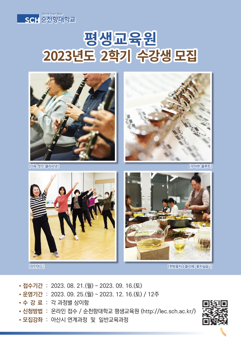 이번 2023학년도 2학기 과정은 교내 일반과정, 아산시 연계과정 총 12주 과정으로 구성되어 있으며, △문화/예술 △건강관리 △교양/취미 △음악 △전문/자격 △예술/표현 △스포츠 △IT 활용 △외국어 등 다양한 분야에서 아산 시민을 위한 풍성한 평생교육 과정을 운영해 눈길을 끈다.