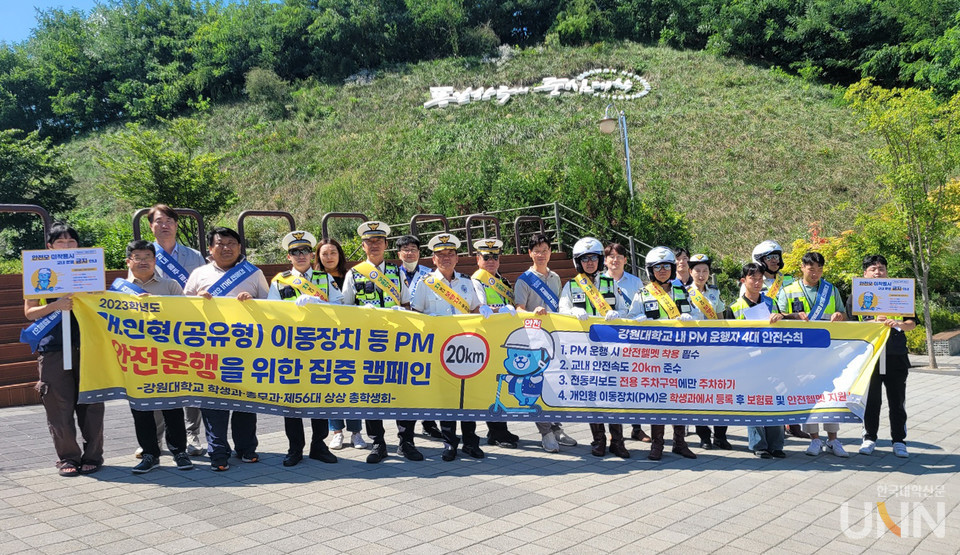 이날 캠페인에서 강원대 학생처 직원 및 교직원 안전지도반, 총학생회 임원, 춘천경찰서 소속 경찰관과 합동으로 안전모 착용과 안전속도(20㎞/h) 준수 등 ‘도로교통법 및 PM 안전수칙’ 홍보물을 배부하고, PM(개인형 이동장치)의 안전한 운행을 위한 캠페인을 실시했다.
