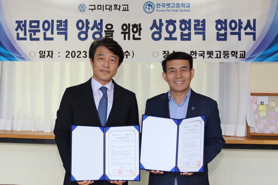 [한국대학신문 정수정 기자] 구미대학교(총장 이승환)는 한국펫고등학교(교장 김동상)와 6일 한국펫고에서 반려동물 보건 전문인력 양성을 위한 상호협력 협약식을 체결했다고 7일 밝혔다.