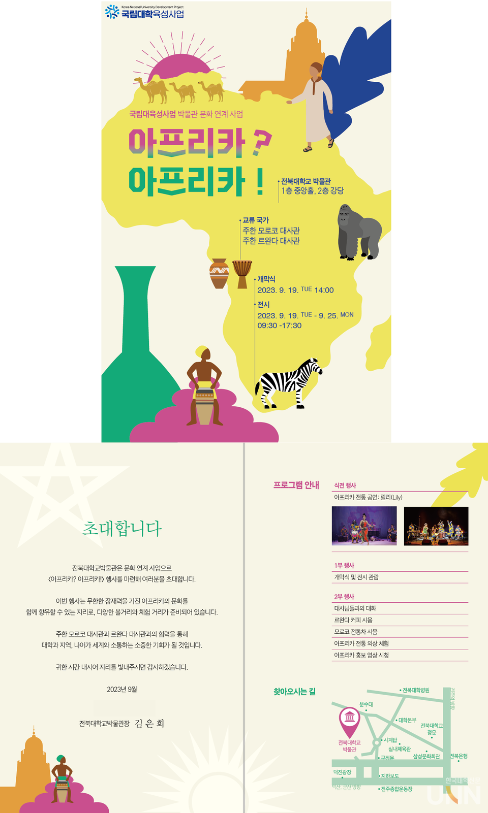 오는 19일 오후 2시 아프리카 전통춤 공연으로 시작되는 이번 행사는 25일까지 전북대 박물관 중앙홀에서 모로코와 르완다 대사관의 문화자료 전시, 그리고 다양한 체험행사들로 채워진다.