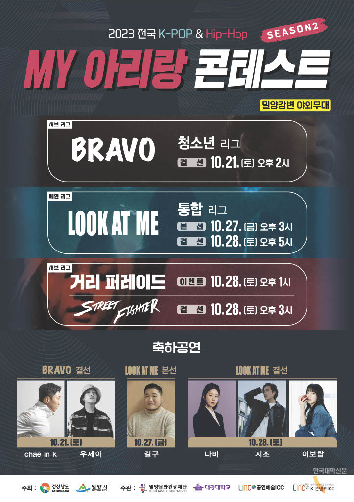 대경대와 경남 밀양시가 공동 주최하고 대경대 LINC3.0 공연예술 ICC, 밀양문화관광재단, 한국영상대 LINC3.0 K-콘텐츠 ICC가 공동 주관하는 ‘2023 전국 K-POP&HIP-HOP CONTEST–My 아리랑 콘테스트’는 2022년에 이어 2년 연속 개최하는 전국 창작 콘테스트로 한류문화 예술을 선도하는 대경대 콘텐츠와 경남 밀양의 정서가 녹아있는 아리랑을 융합해 K-POP(댄스, 보컬), HIP-HOP, 스트릿 댄스(배틀) 부문의 다양한 콘텐츠를 창출하고 경합하는 대회이다.
