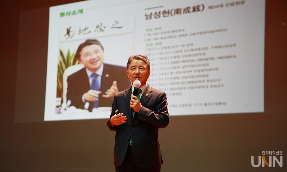 남성현 청장은 강연을 통해 우리나라 숲의 현주소와 숲 경영의 중요성에 대해 설명하며 “숲도 점차 고령화되어 건강한 나무가 부족한 오늘날, 건강하고 가치 있는 숲을 조성하기 위한 노력이 필요하다”고 말했다. 이어 “기후위기가 전 세계적 문제로 대두되고 있다. 지속가능한 산림경영으로 산림생물다양성 보존 방안에 대해 진지하게 고민해야 한다”고 학생들에게 일상에서의 산림 보호 실천을 독려했다.