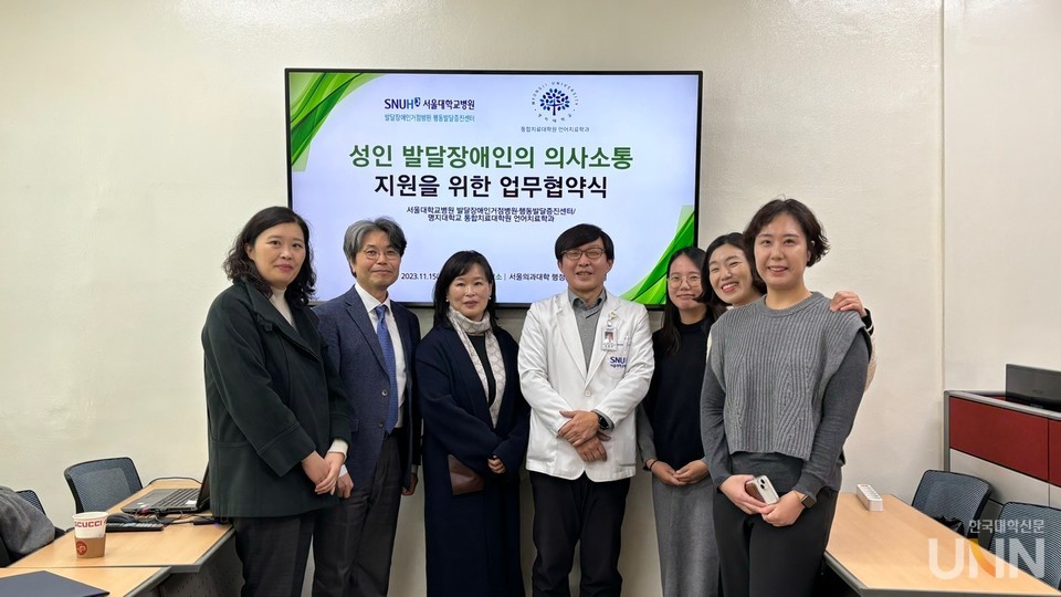 [한국대학신문 이정환 기자] 명지대학교(총장 유병진) 통합치료대학원 언어치료학과가 지난 15일 서울대학교병원 발달장애인거점병원·행동발달증진센터와 ‘성인 발달장애인의 의사소통 지원을 위한 업무협약’을 체결했다.