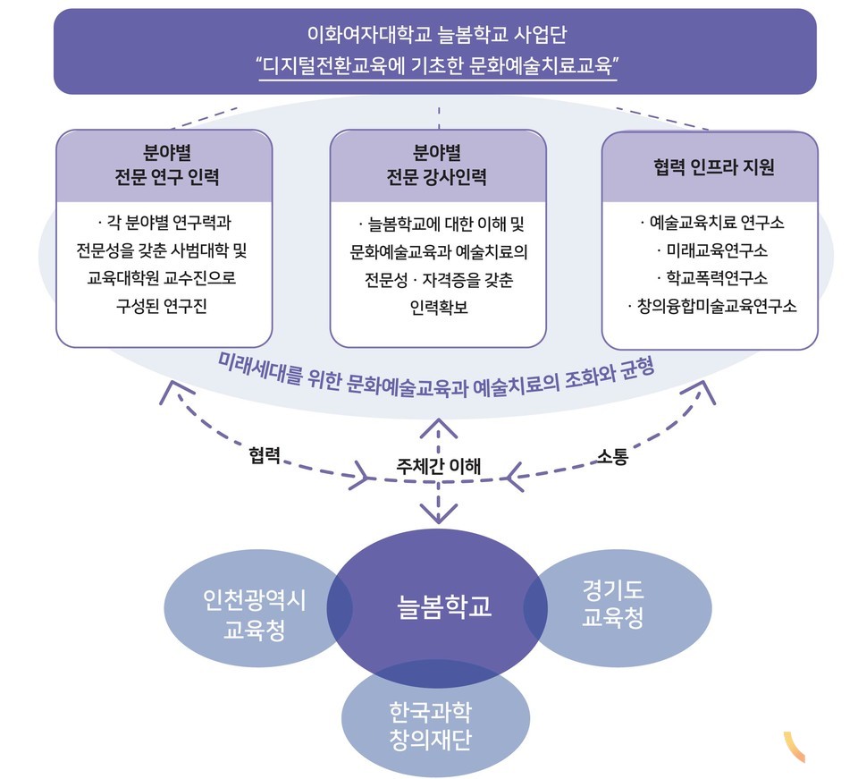 이화여대 늘봄학교 사업팀은 늘봄학교 학생들의 미래 사회 대응 역량을 키우기 위해 ‘디지털전환교육에 기초한 문화예술교육 및 예술치료의 허브 구축’을 비전으로 문화예술, 심리정서, 창의·과학 3개 분야의 교육 프로그램 개발에 나선다. 문화예술 분야는 음악, 미술, 무용, 연극 분야에 걸쳐 진행되며, 심리정서 분야는 음악과 미술치료를 기반으로, 창의·과학 분야는 요즘 화두인 디지털 융합을 키워드로 교육 프로그램이 설계될 예정이다. 교육 프로그램을 통해 미래세대를 위한 예술교육과 예술치료의 조화와 균형을 이루는 것이 목표이다.