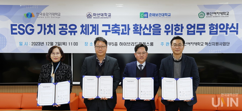 마산대학교 전문대학 혁신지원사업단(단장 이상원), 부산여자대학교 전문대학 혁신지원사업단(단장 강화정), 춘해보건대학교 전문대학 혁신지원사업단(단장 남현욱) 한국승강기대학교 전문대학 혁신지원사업단(단장 김승호) 등 부울경 지역 주요 4개 대학은 7일 부산여대에서 대학이 주체가 돼 ESG 가치를 발견하고 올바른 실천 방안을 제안하는 콘텐츠와 기술, 서비스 아이디어 공유를 담은 ‘ESG 가치 공유 체계 구축과 확산을 위한 업무 협약’을 체결하고 본격적인 실천 방안을 모색하기로 했다.
